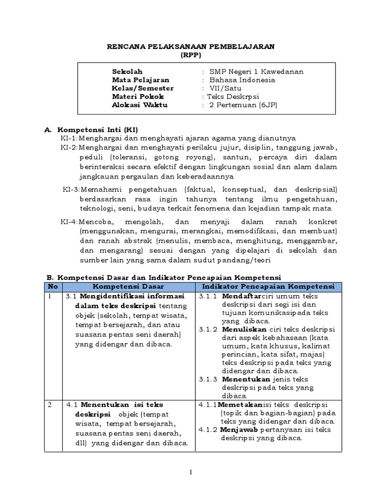 DOC) RPP BAHASA INDONESIA VII TEKS DESKRIPSI | Asisten Nur - Academia.edu