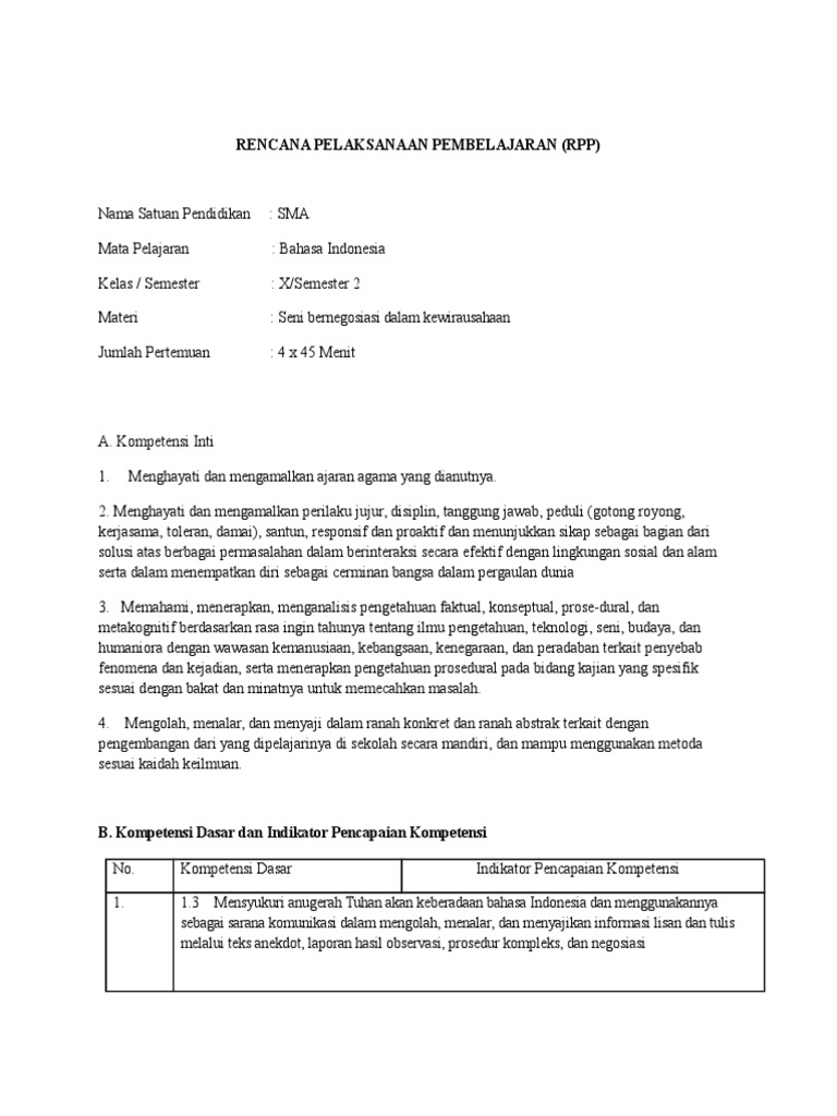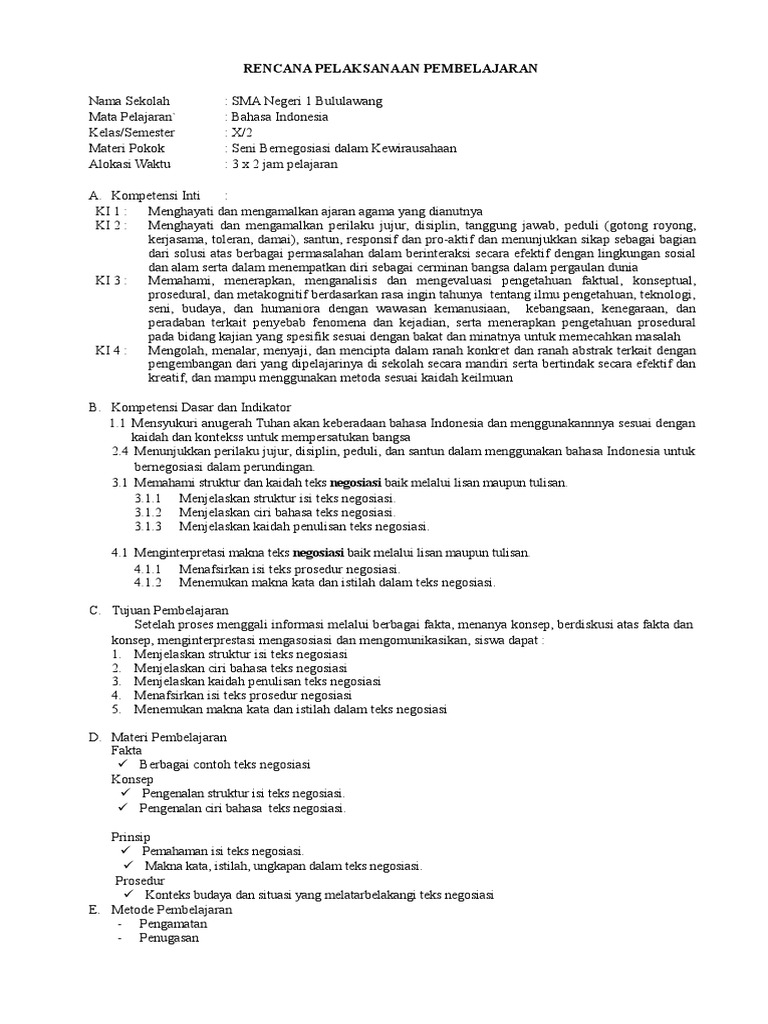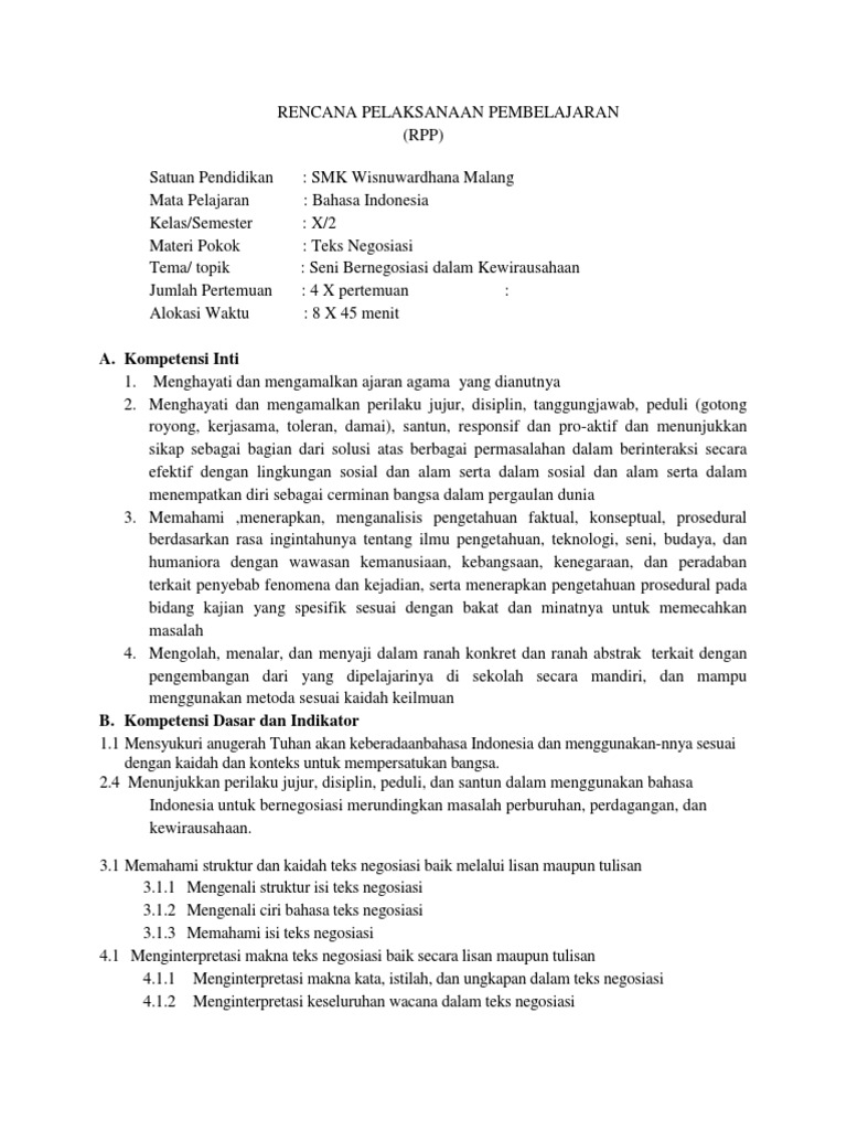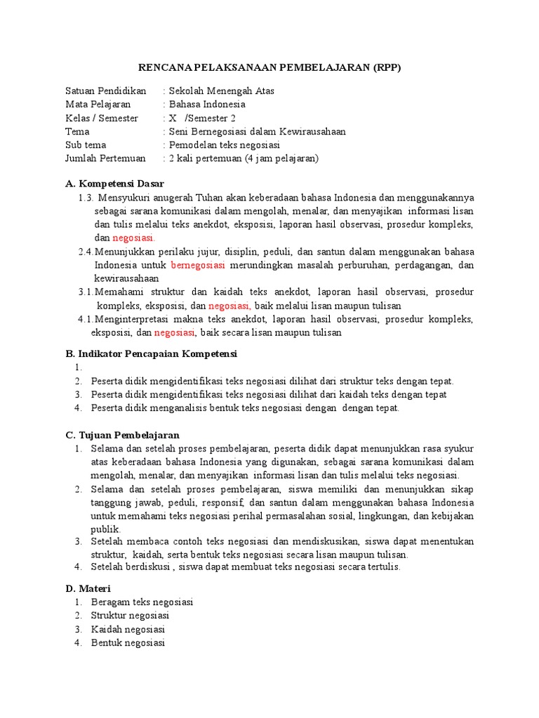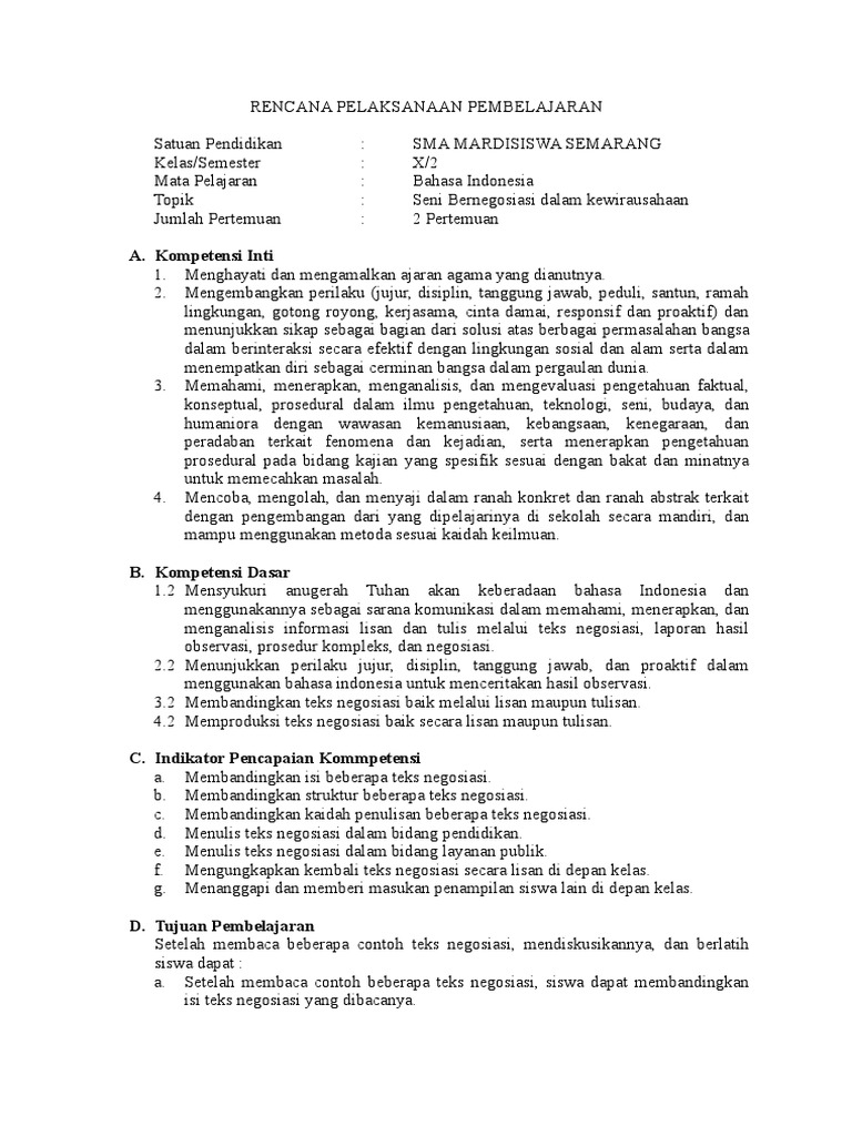 PDF) RPP TEKS NEGOSIASI BAHASA INDONESIA KELAS X | Arief Kurniatama - Academia.edu