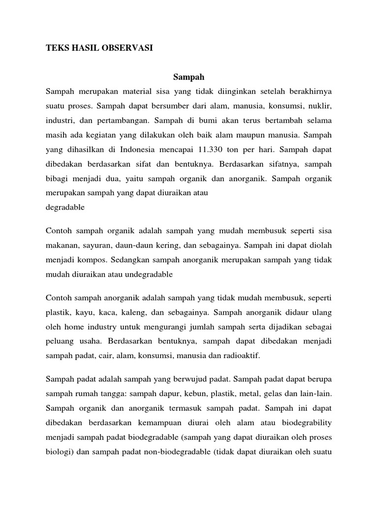 DOC) Contoh Laporan Hasil Observasi Tugas Teks Laporan Observasi Lingkungan: Sampah SAMPAH | ngurah panji - Academia.edu