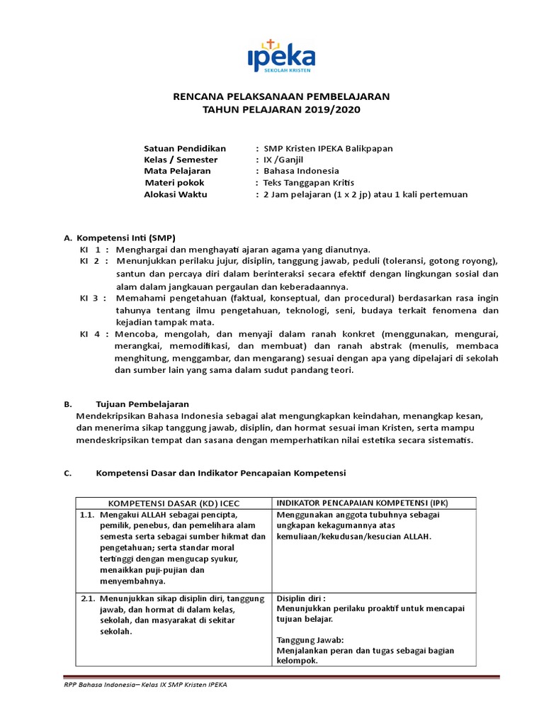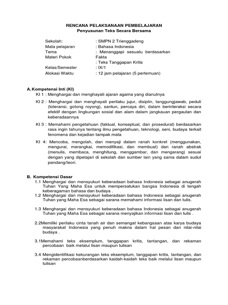 RPP 9 4. TEKS TANGGAPAN.docx - RENCANA PELAKSANAAN PEMBELAJARAN(RPP 4 Nama Sekolah Mata Pelajaran Kelas/Semester Materi Pokok Alokasi Waktu SMP Negeri 2 | Course Hero