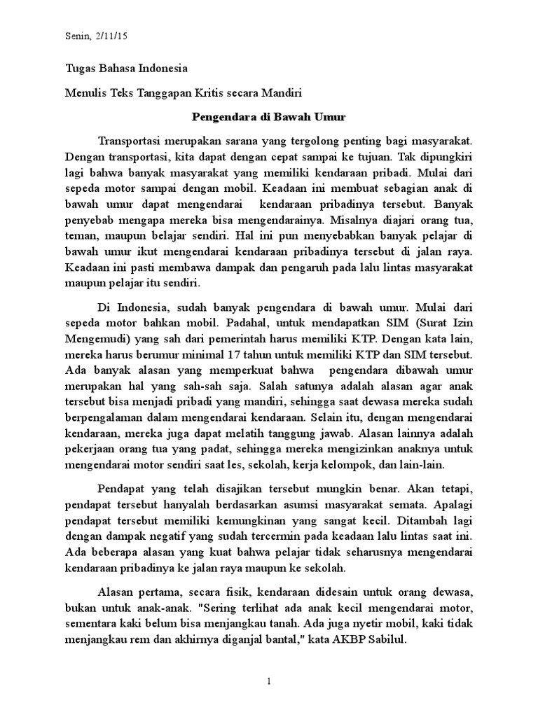 Teks Tanggapan Kritis: Pengendara Motor di Bawah Umur