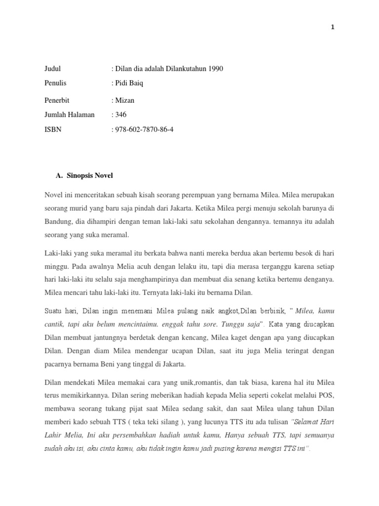 RESENSI NOVEL.docx - RESENSI NOVEL DILAN 1990 a Identitas Buku \u2013 Judul Buku Dilan 1990 \u2013 Tahun Terbit 2015 \u2013 Penulis Pidi Baiq \u2013 Penerbit Pastel | Course Hero