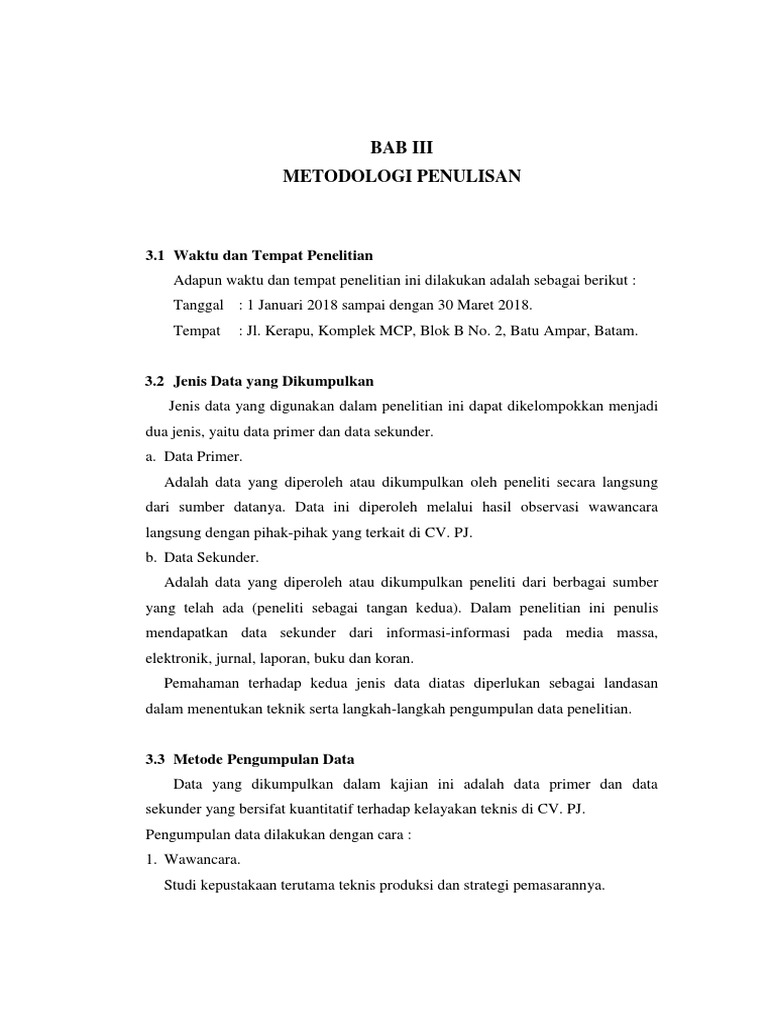 Bab Iii Metodologi Penulisan: 3.1 Waktu dan Tempat Penelitian