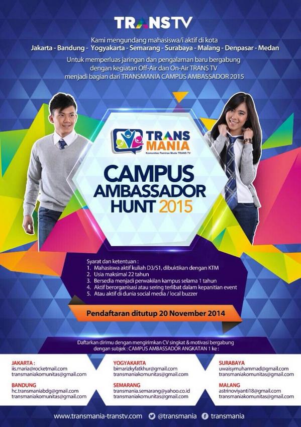 acara malang auf Twitter: “» #Acara @transmania Campus Ambassador by @TRANSTV_CORP Pendaftaran s/d 20 Nov 14 MALANG astrinoviyanti18@gmail.com http://t.co/7js0ujwRIE”