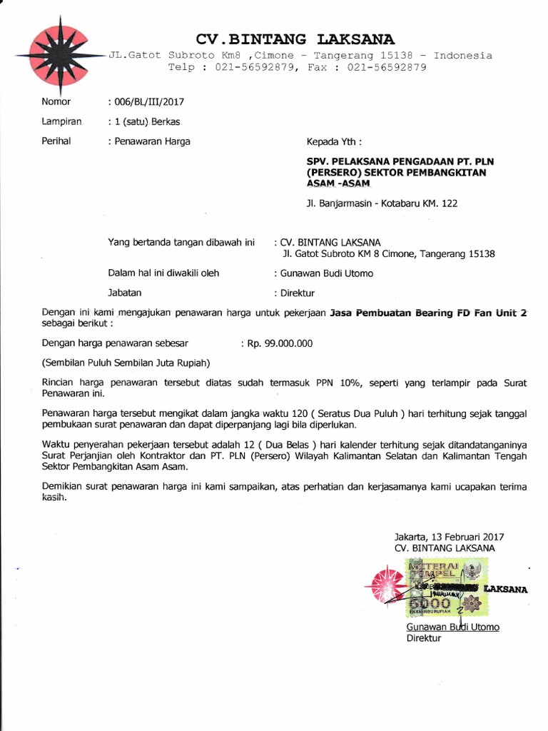 Penawaran Harga Pendamping CV. Bintang Laksana Pek. Jasa Pembuatan Bearing FD Fan Unit 2