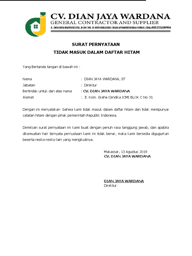 Surat Pernyataan Tidak Masuk Dalam Daftar Hitam: Cv. Dian Jaya Wardana