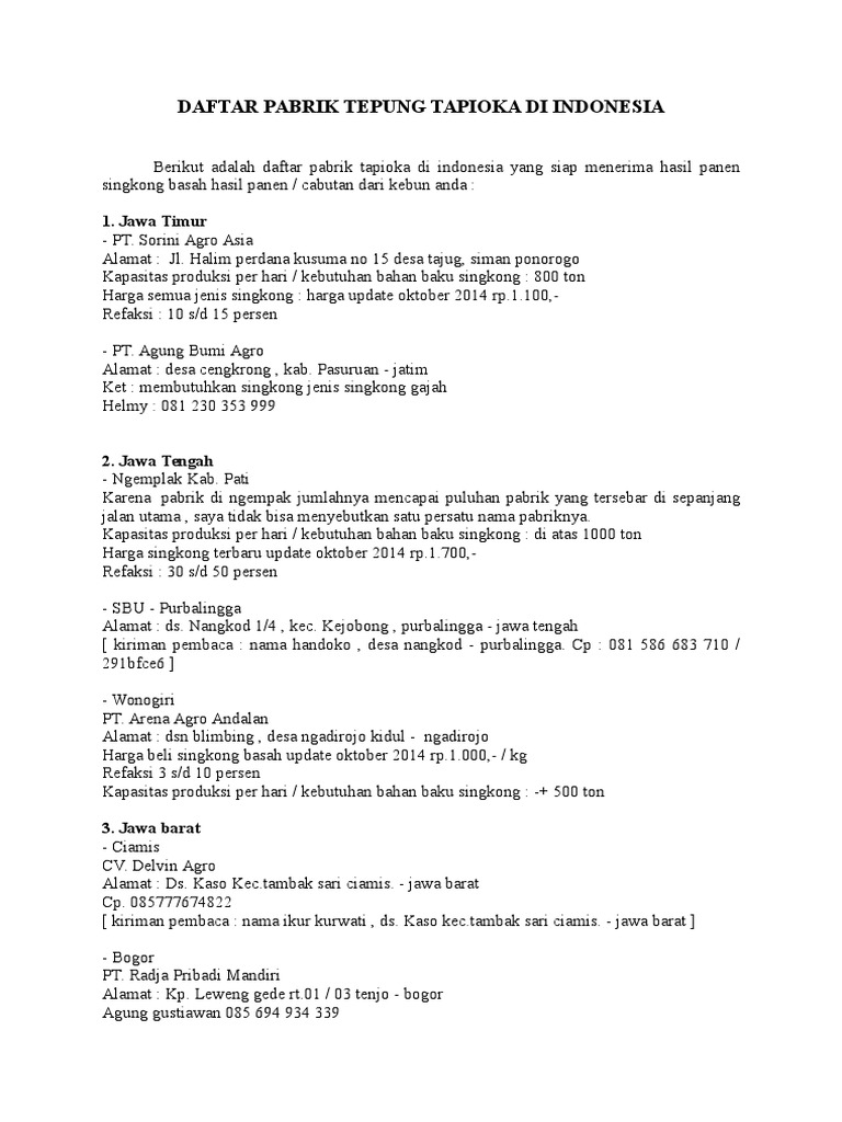 Daftar Pabrik Tepung Tapioka Di Indonesia