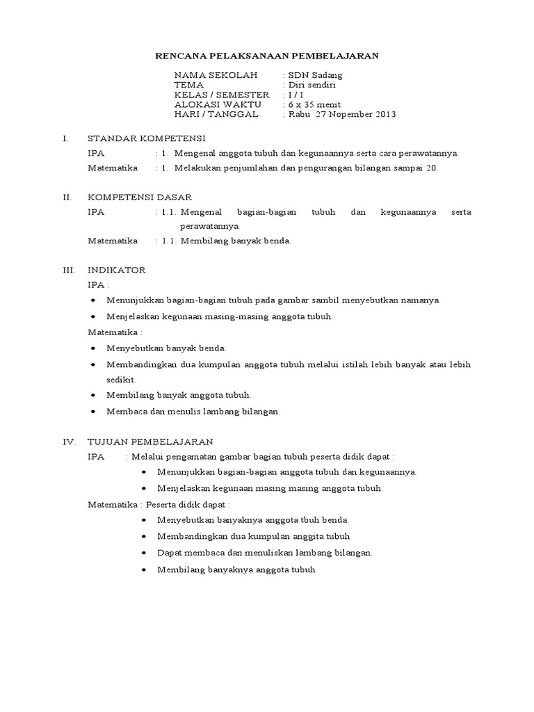 RPP Kelas 1 Semester 1 Diri Sendiri