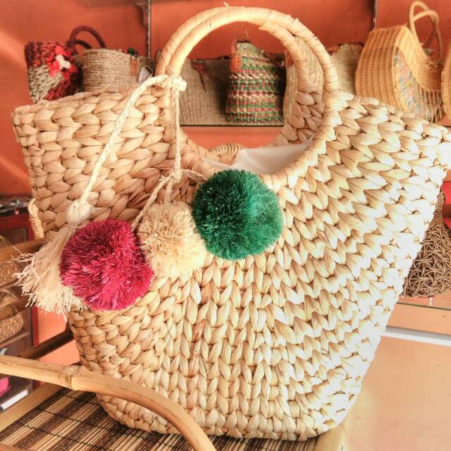 Tas anyaman unik model kerucut hiasan pom-pom gajih | Shopee Indonesia