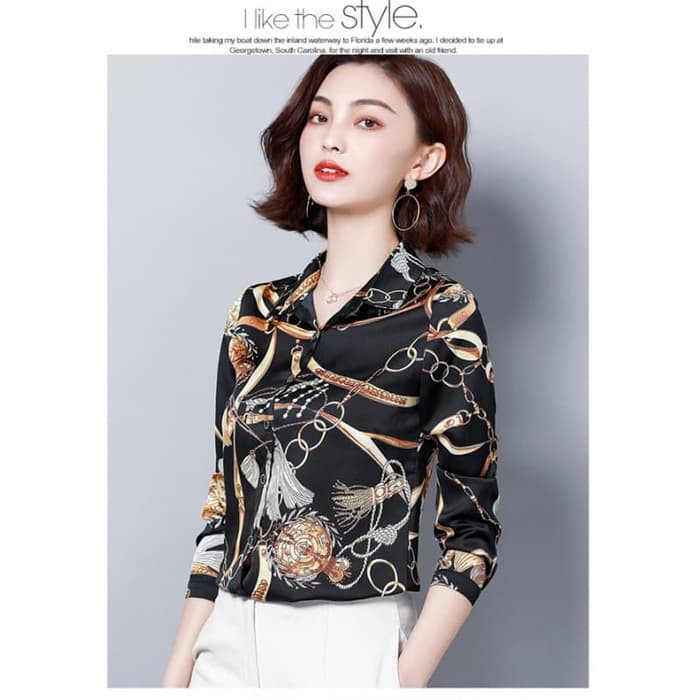 Kemeja wanita hitam katun motif gambar cantik korea lengan panjang | Shopee Indonesia