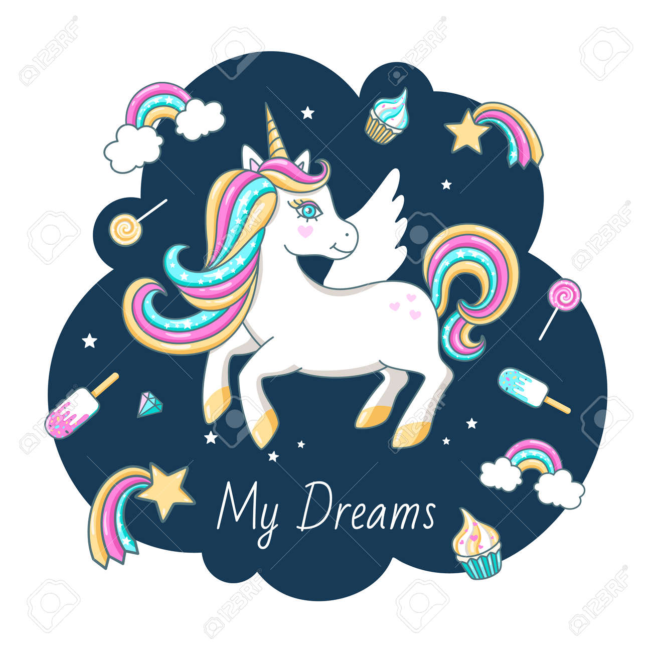 White Cute Unicorn With Inscription - My Dreams. For Print Design… Royalty Free Cliparts, Vectors, And Stock Illustration. Image 93936746.