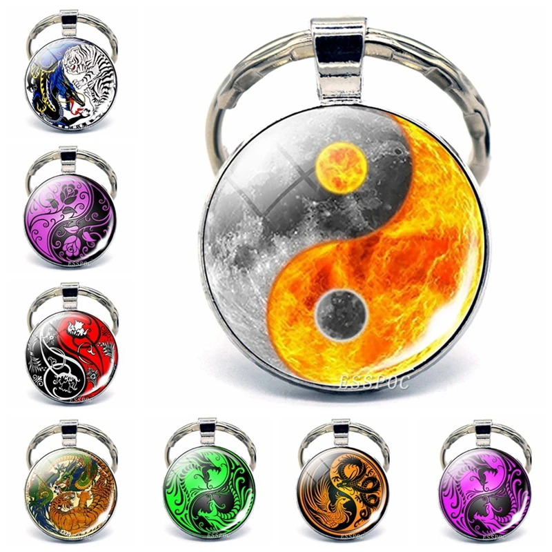Yin Yang Gantungan Kunci Seni Yin Yang Tai Chi Naga, bianhua Gambar Kaca Cabochon Logam Gantungan Kunci Aksesoris Fashion untuk Pria Wanita-in Gantungan kunci from Perhiasan & Aksesoris on AliExpress