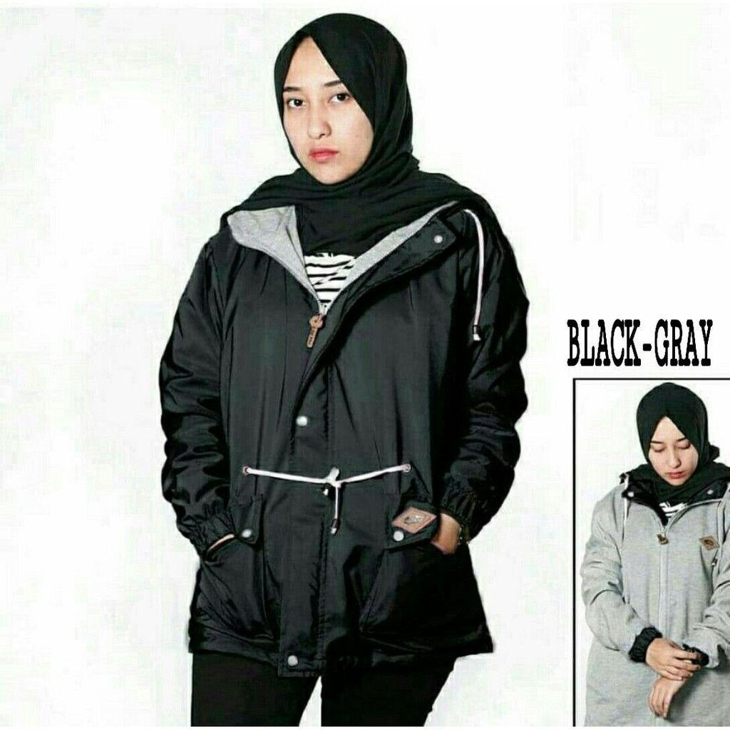 Jual Jaket Parka Wanita Bolak-balik Bahan Parasut Fleece Hitam - Abu | BLANJA.com