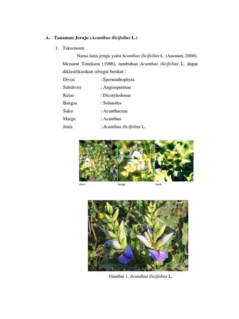 BAB II TINJAUAN PUSTAKA A. Tanaman Jeruju(Acanthus ilicifolius L.) 1. Karakteristik Umum Tanaman Salah satu genus hutan mangrove