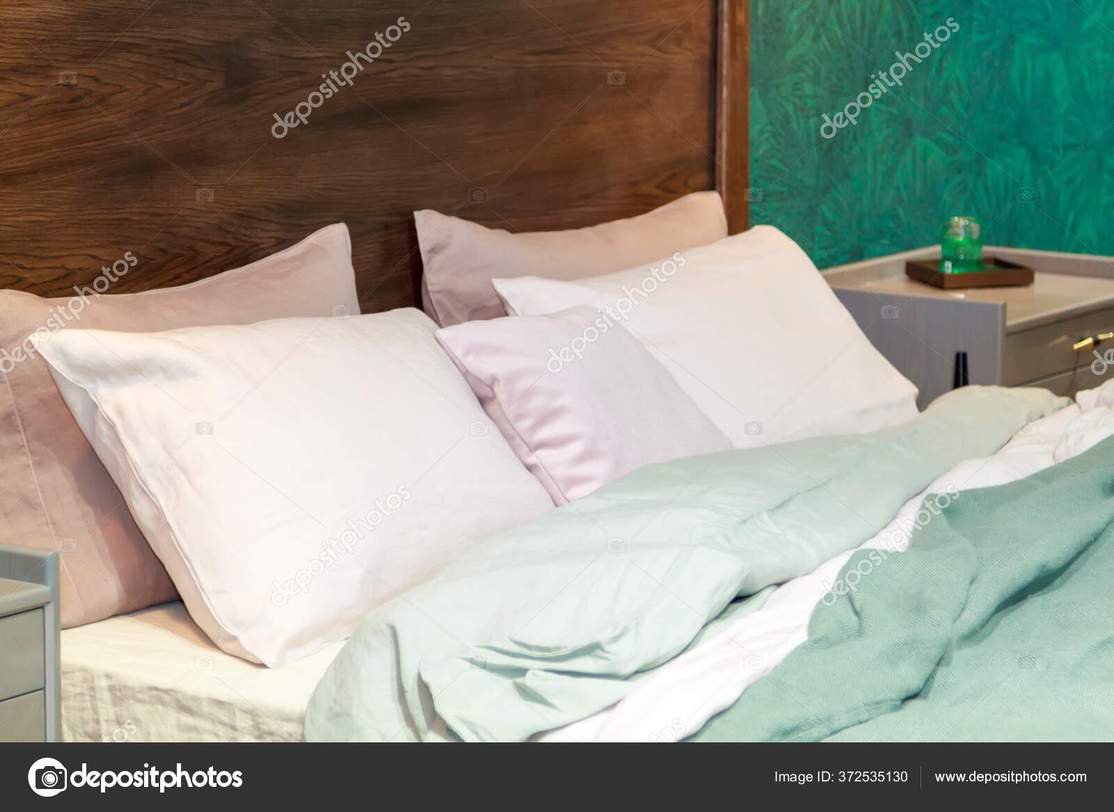 Close Selimut Baru Berwarna Mint Dengan Bantal Dekoratif Papan Kepala — Stok Foto © sommersby #372535130