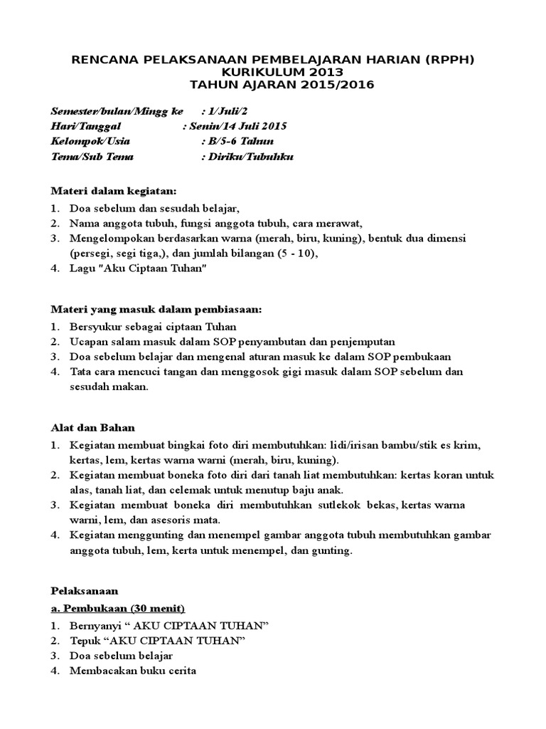 Rpph Paud Tema Diri Sendiri Kurikulum 2013