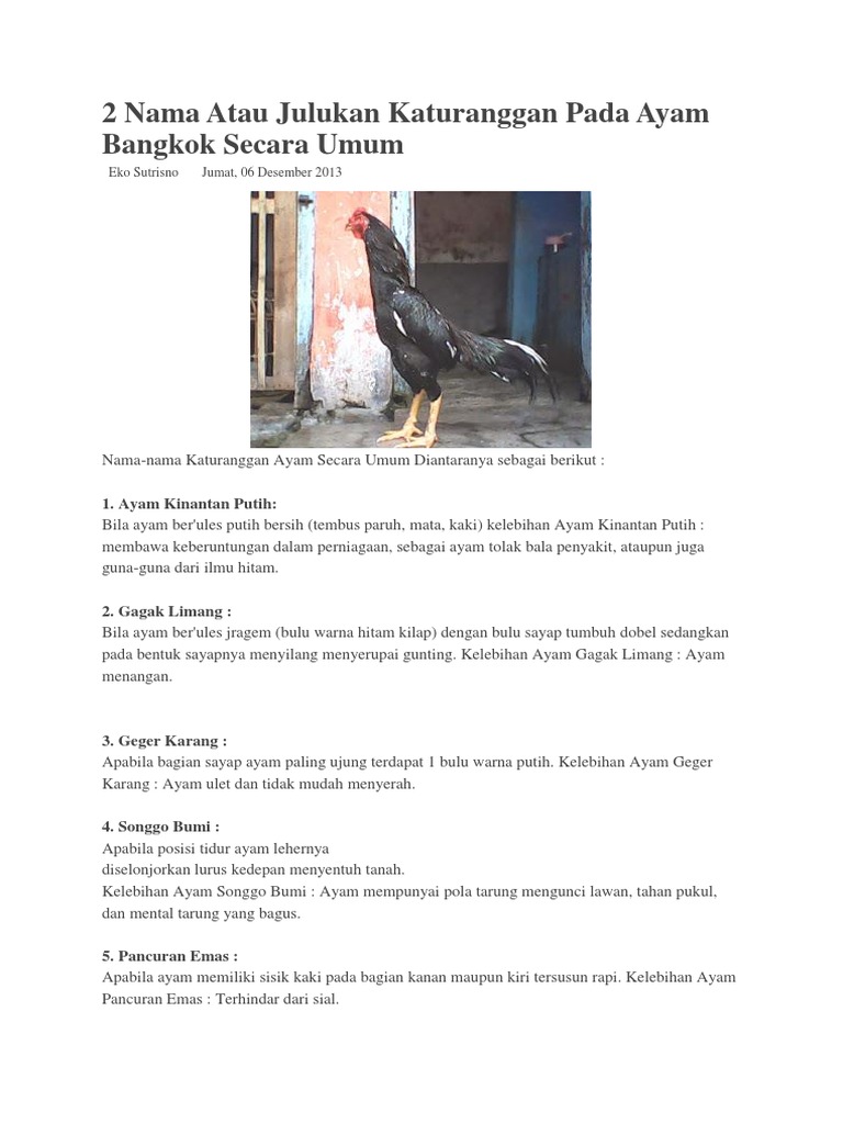 2 Nama Atau Julukan Katuranggan Pada Ayam Bangkok Secara Umum