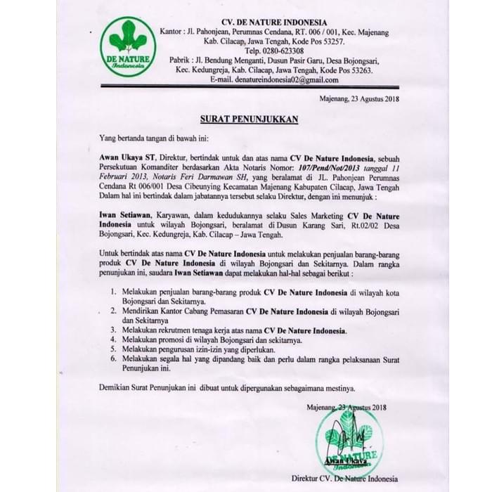 Surat penunjukan agen De Nature Indonesia 081215407069 - Imgur