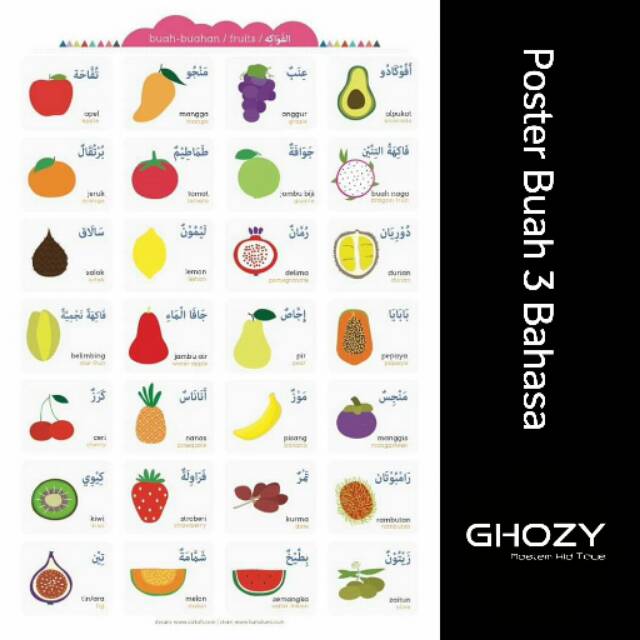 Poster Buah-Buahan 3 Bahasa (Indonesia, Inggris, Arab) – Yufid Store Toko Muslim
