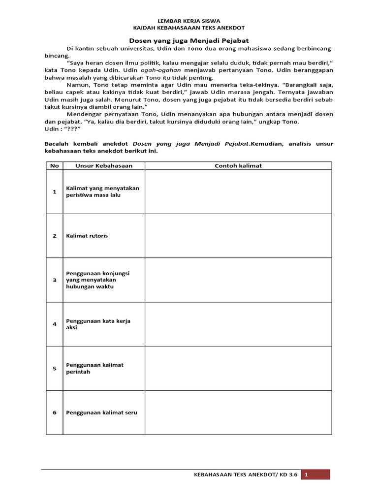 analisis unsur kebahasaan teks anekdot dosen yang menjadi pejabat - Brainly.co.id