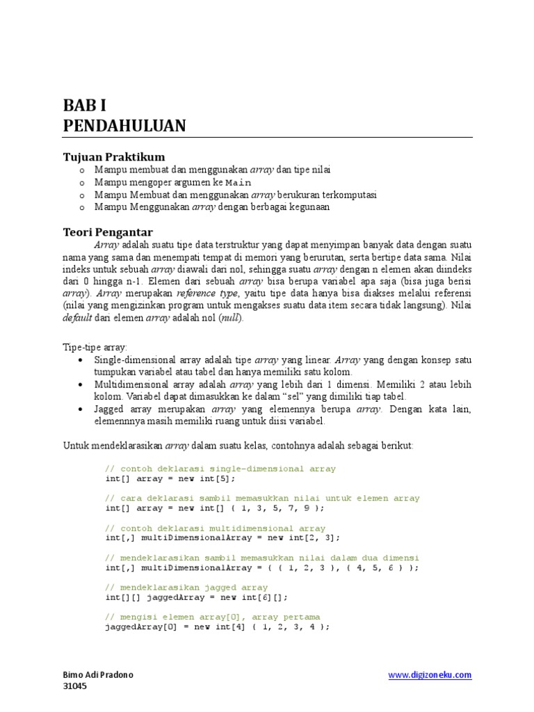 Pertemuan Arrays. Obyektif Praktikum : 1. Memahami penggunaan Array. 2. Dapat menerapkan array dengan elemen multidimensi - PDF Free Download