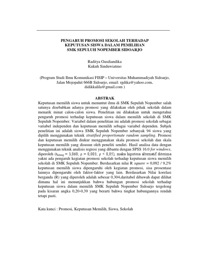 Pengaruh Promosi Sekolah Terhadap Keputusan Siswa Dalam Pemilihan Smk Sepuluh Nopember Sidoarjo Oleh Raditya Gusdiandika Dan Kukuh Sinduwiatmo