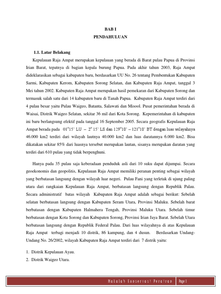 Makalah Tourism Destinasi Raja Ampat.docx - BAB I PENDAHULUAN 1.1 Latar Belakang Kepulauan Raja Ampat merupakan rangkaian empat gugusan pulau yang | Course Hero