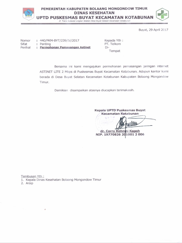 Surat Permohonan Pemasangan Astinet Di Puskesmas Buyat