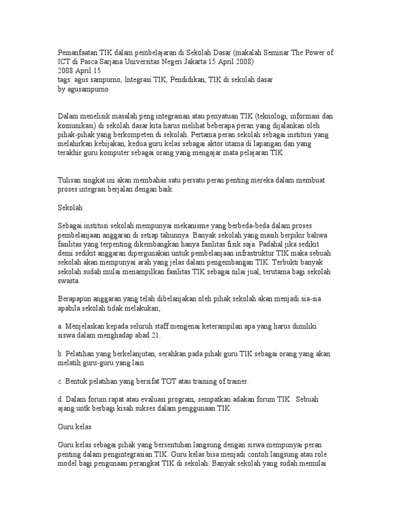 Pemanfaatan TIK Dalam Pembelajaran Di Sekolah Dasar