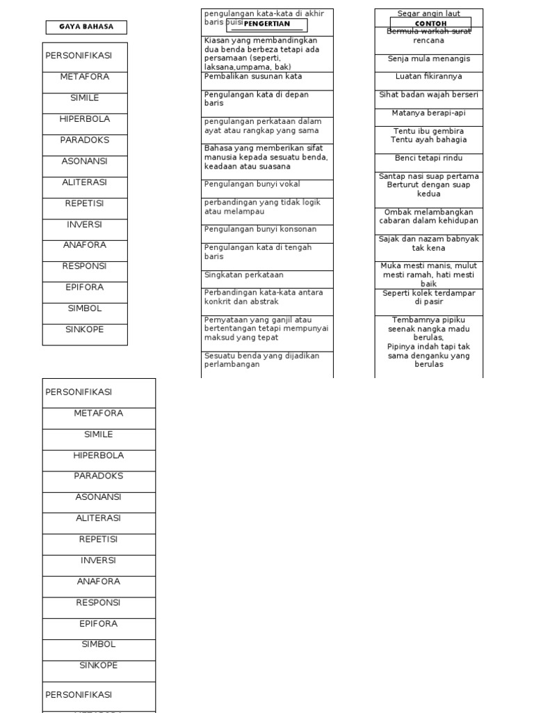 Personifikasi Metafora Simile Hiperbola Paradoks Asonansi Aliterasi Repetisi Inversi Anafora Responsi Epifora Simbol Sinkope