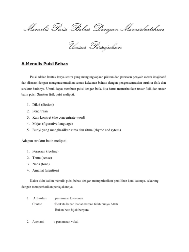 Menulis Puisi Bebas Dengan Memerhatikan Unsur Persajakan
