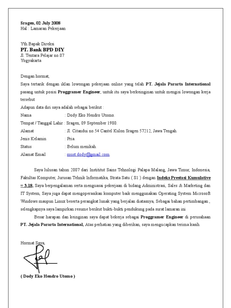 Contoh Surat Lamaran Kerja Bank Bpd Aceh