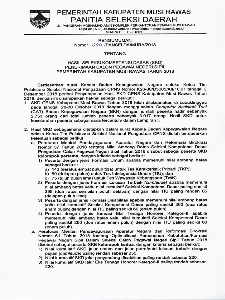 Kelulusan Tes CPNS Kab Musi Rawas Tahun 2010 Oktober 2020 Terbaru - Info CPNS 2020 & BUMN 2020