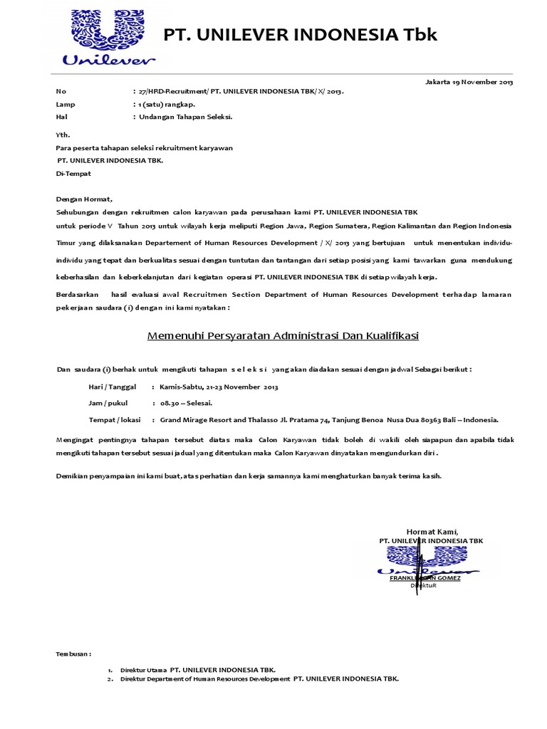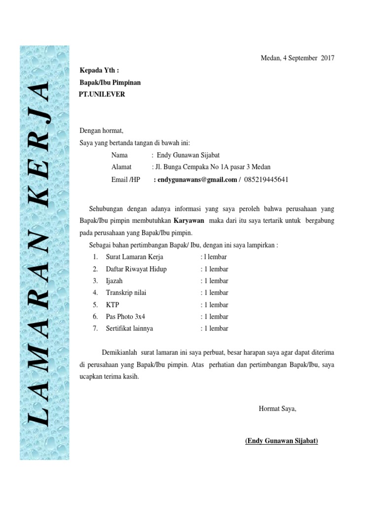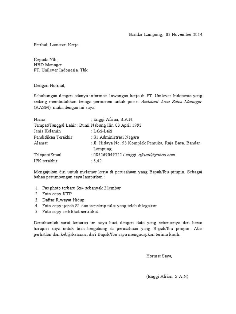 Contoh Surat Lamaran Kerja Di Pt Unilever