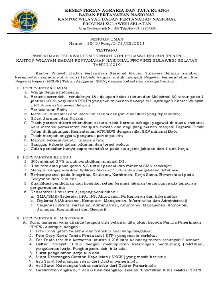 Rekrutmen Non Pegawai PPNPN Kementerian Agraria dan Tata Ruang, Buka hingga 14 Juni 2019 Ayo Daftar! - Halaman all - Tribun Palu