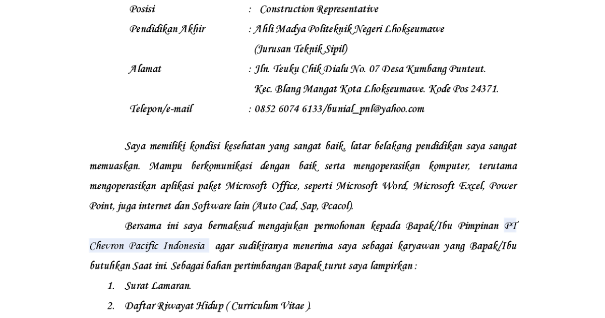 Contoh Surat Lamaran Kerja Ke PT Chevron ben jobs