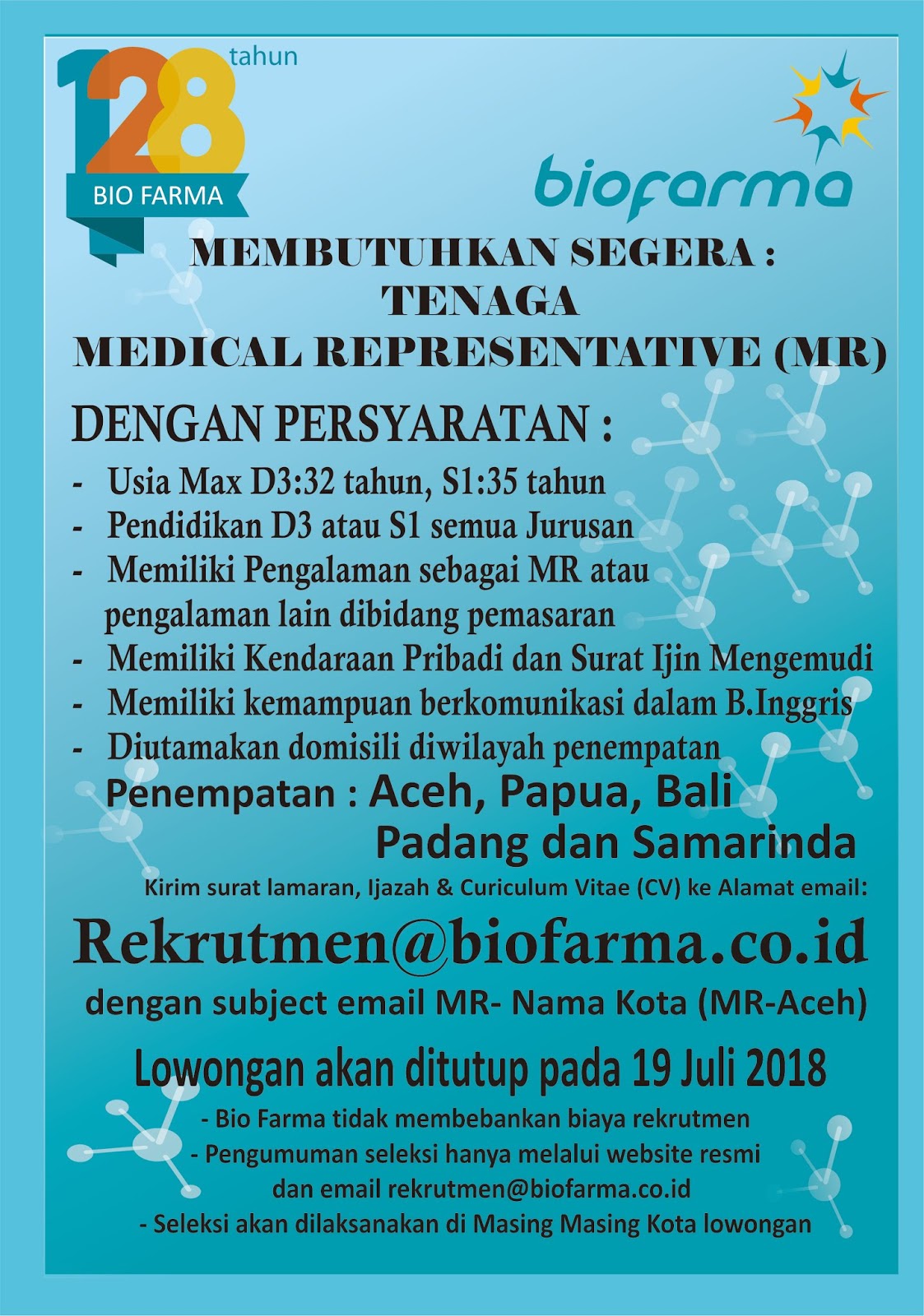 Lowongan Kerja Bio Farma Medical Representative (MR) Tahun 2017 | Lowongan Kerja Terbaru Lulusan SMA D3 dan S1 Semua Jurusan 2020