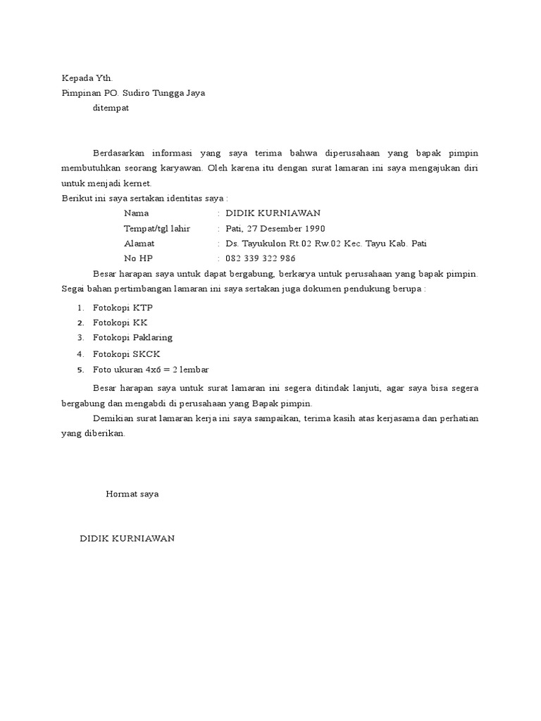 Contoh Surat Lamaran Kerja Kernet Bus