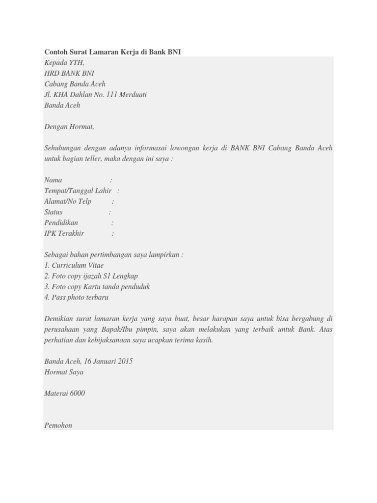 DOC) Contoh Surat Lamaran Kerja Bank BNI | Muhammad Arya Mandagi - Academia.edu