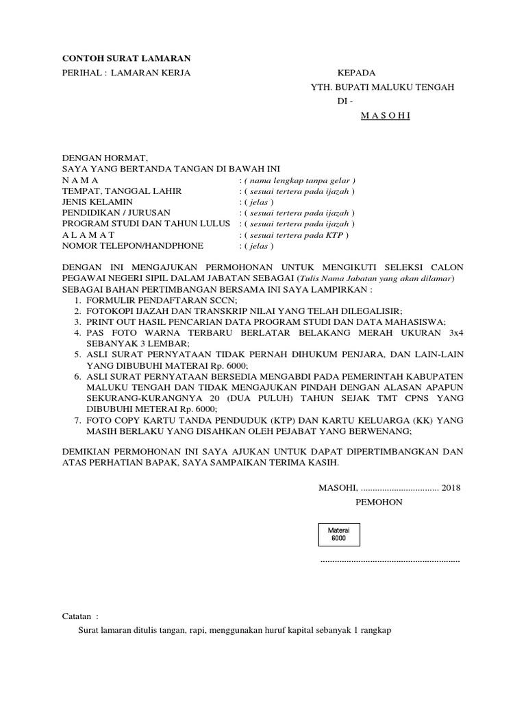 CONTOH SURAT LAMARAN PESERTA CPNS (TULISAN bkd. . surat pernyataan yang ditandatangani di atas materai - [PDF Document]