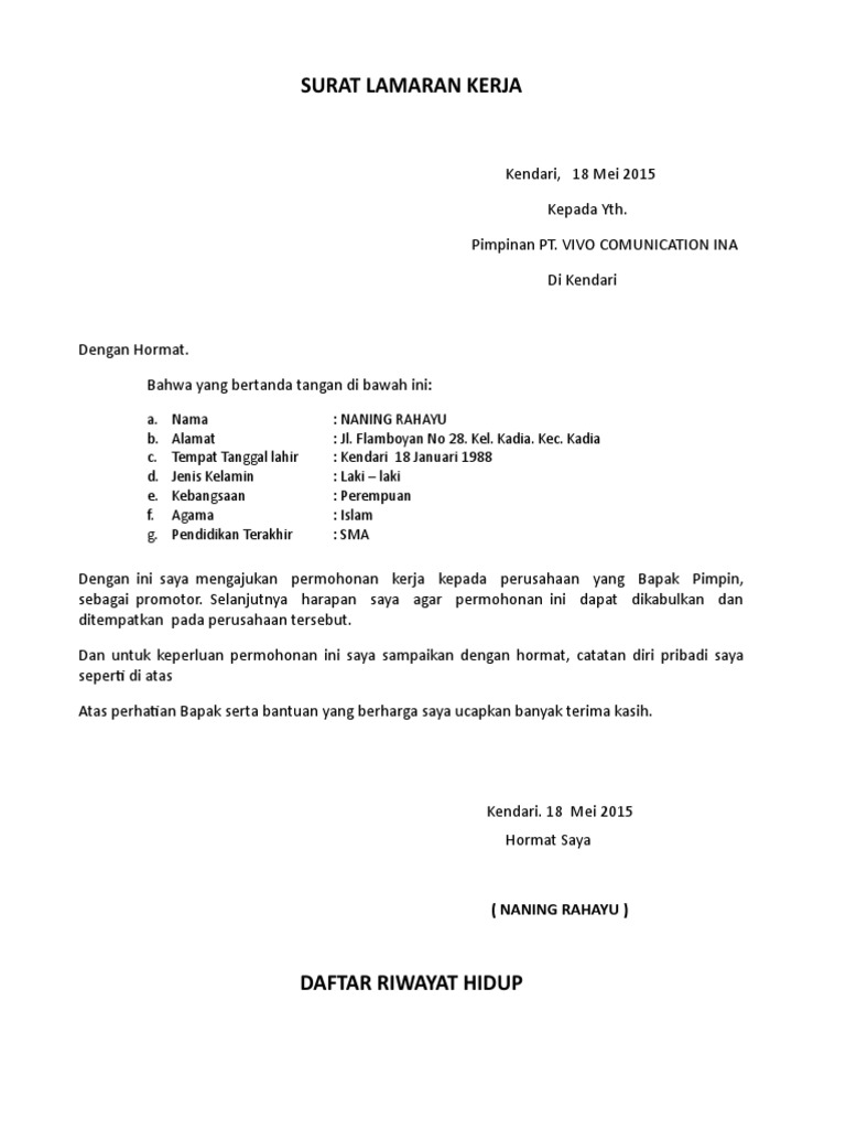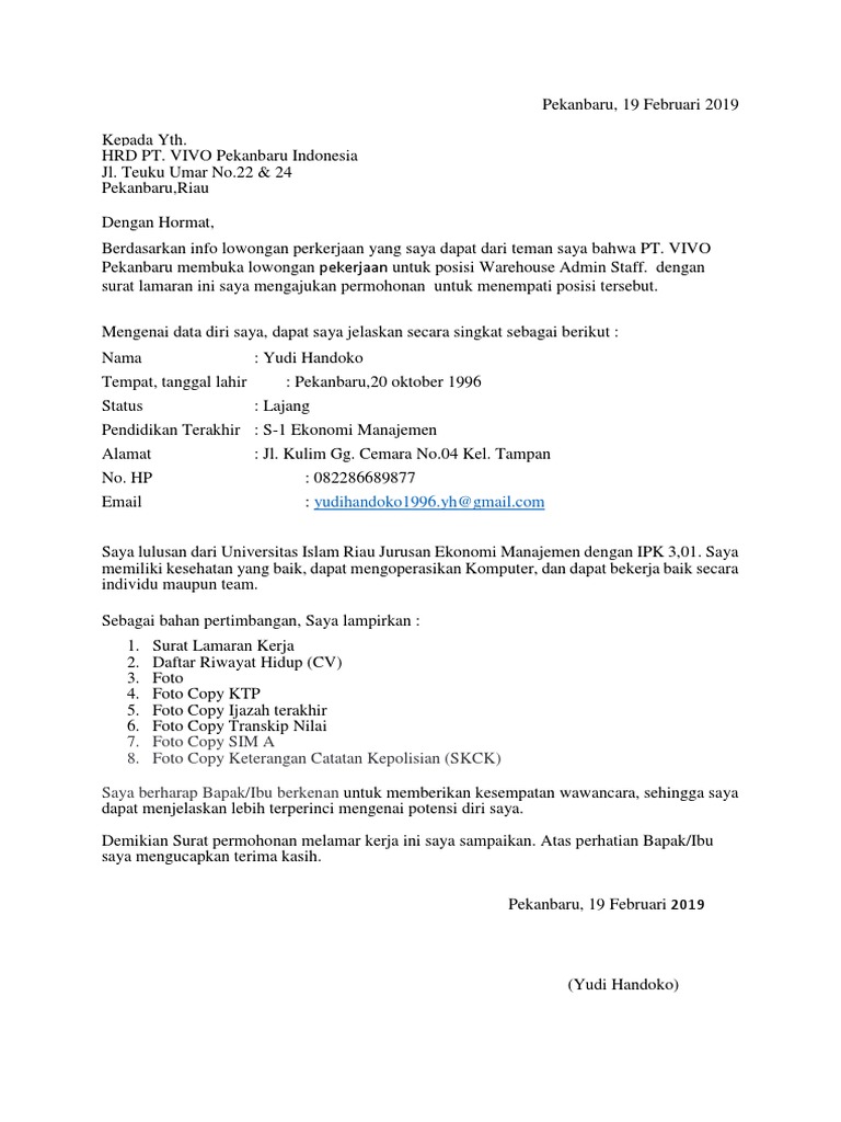 Contoh Surat Lamaran Kerja Vivo - Contoh Surat Lamaran