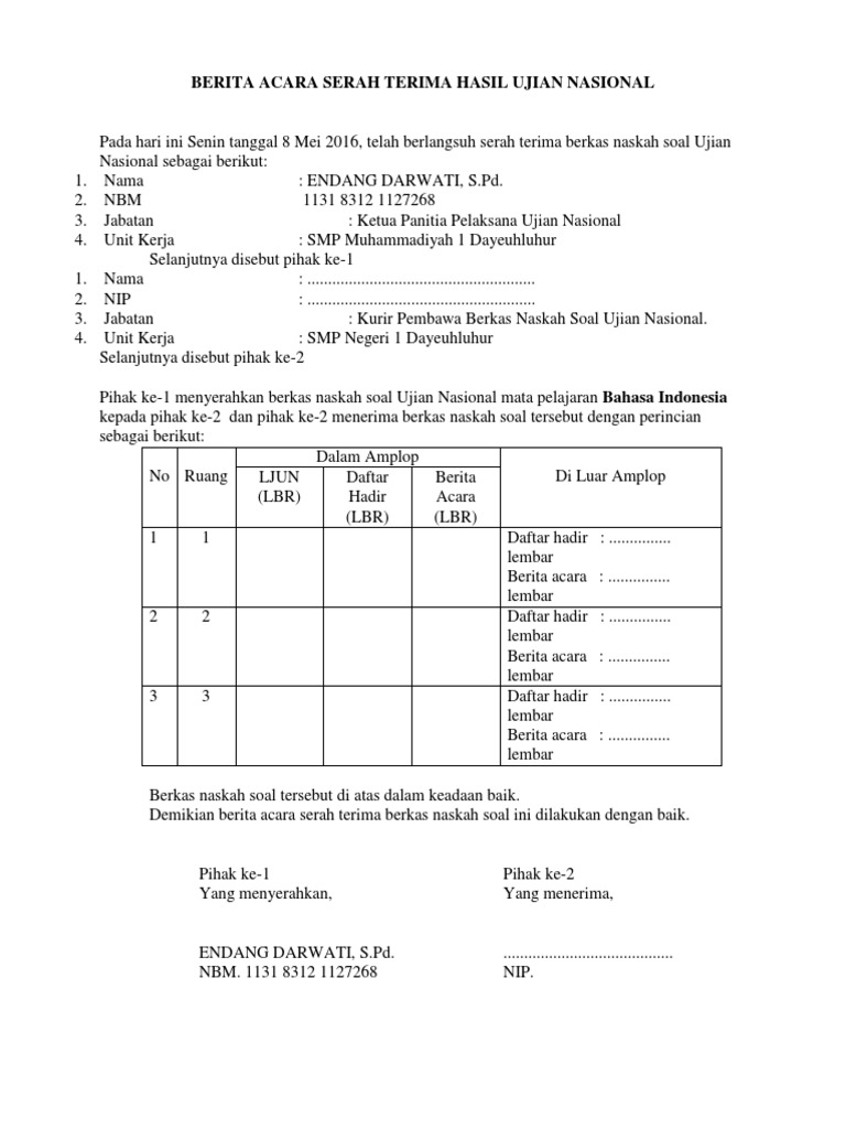 Berita Acara Serah Terima Hasil Ujian Sekolah