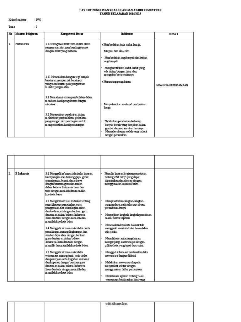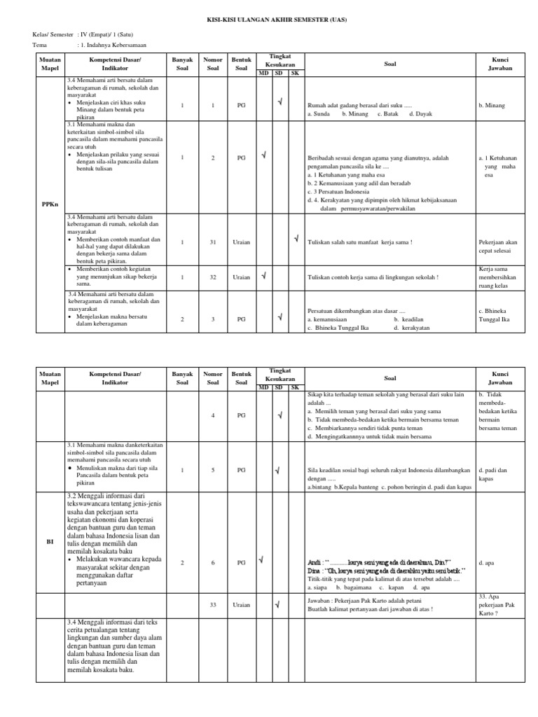 Kisi-kisi Tematik Uas Smster 1 Kelas 4