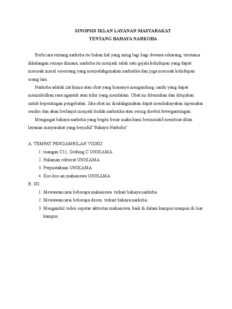 SINOPSIS IKLAN LAYANAN MASYARAKAT TENTANG BAHAYA NARKOBA Berbicara tentang narkoba itu bukan hal yang asing