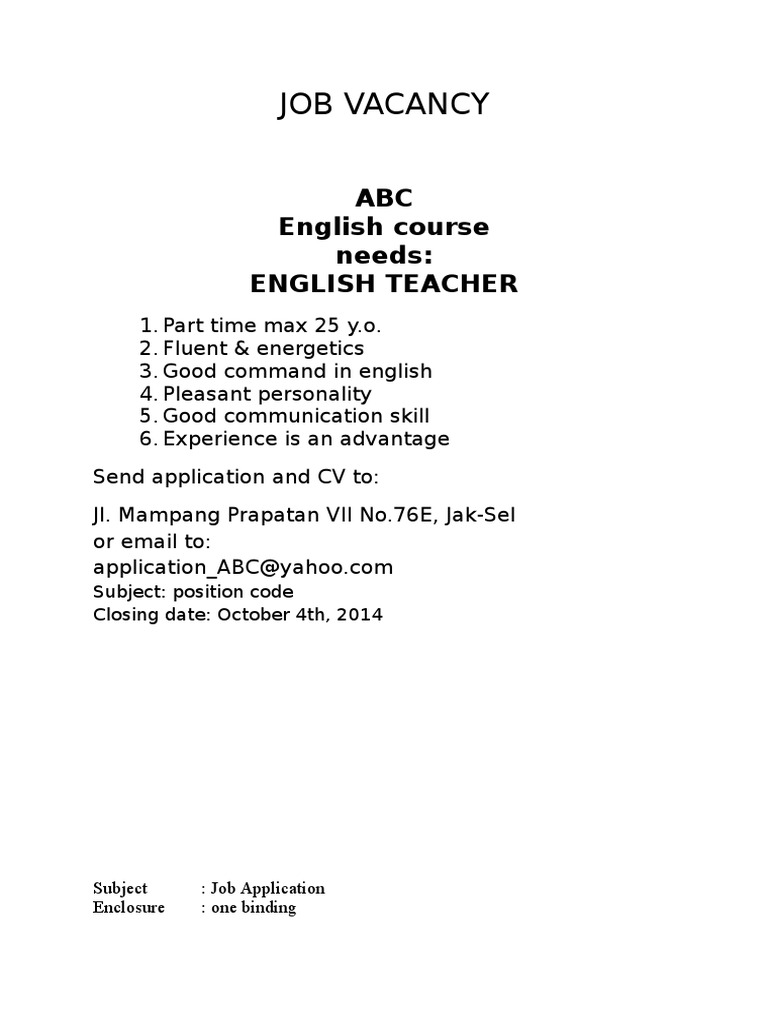 Contoh job vacancy dan application letter dalam bahasa inggris