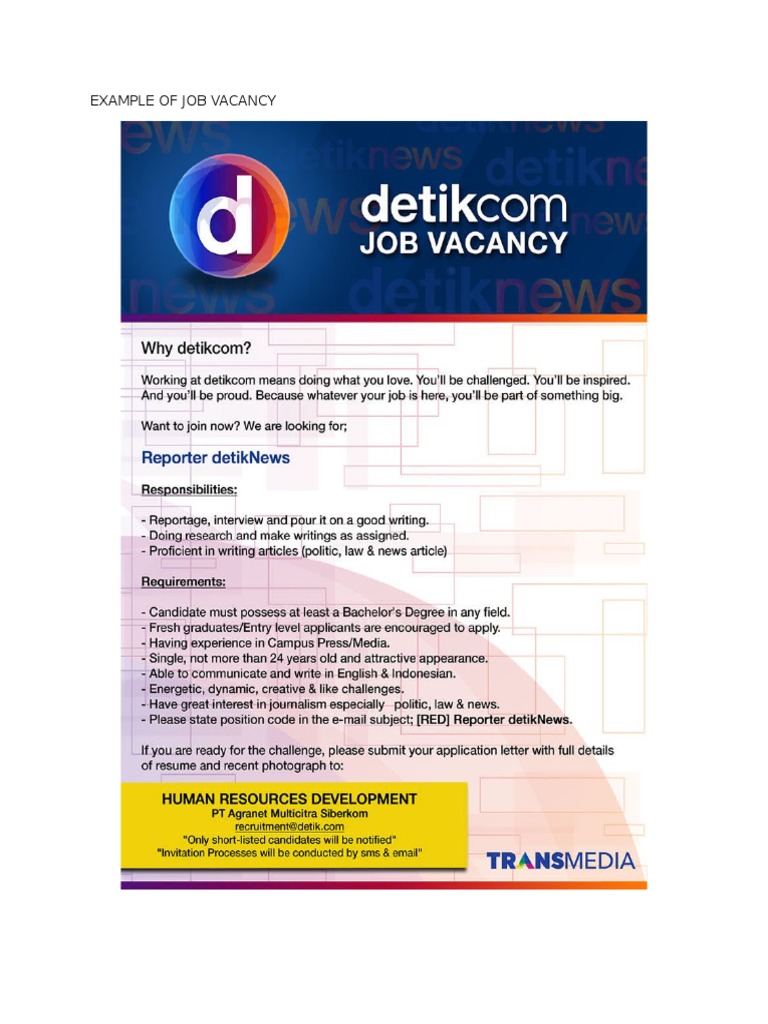 Contoh Job Vacancy / Job Advertisement dalam Bahasa Inggris - Hello..!!