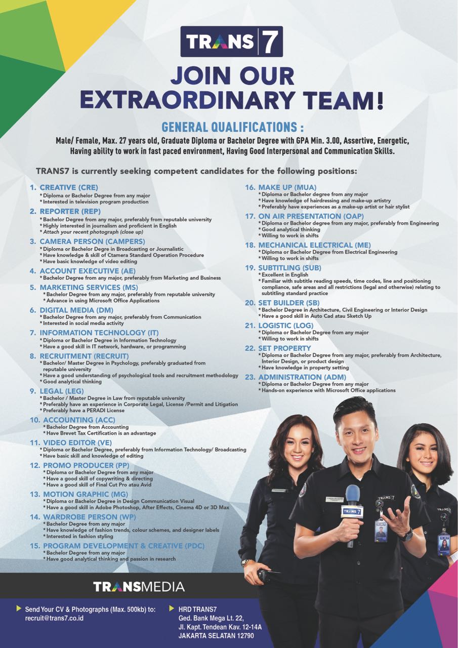 HUMAN RESOURCES TRANS7 on Twitter: “We’re hiring! Send your CV & pas photo to recruit@trans7.co.id (max. 500 kb) http://t.co/ZrQXoxECxR”