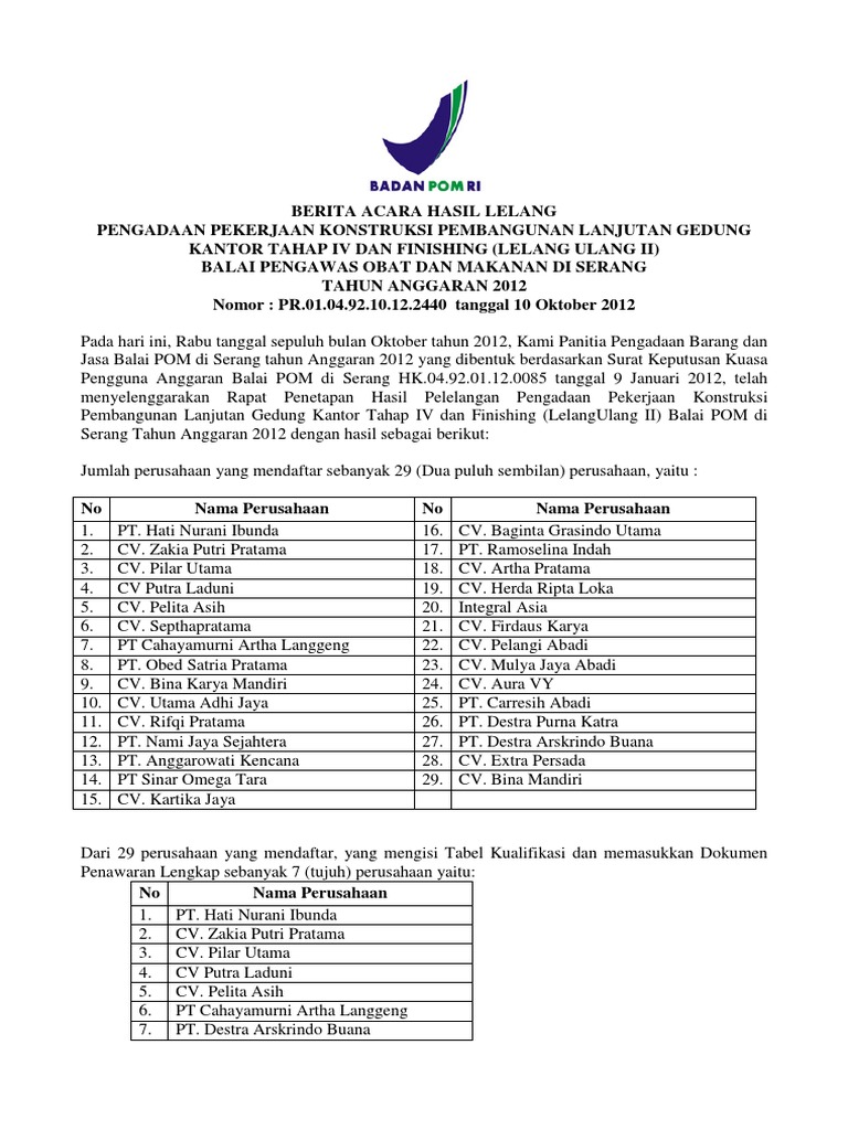 BERITA ACARA EVALUASI PENAWARAN