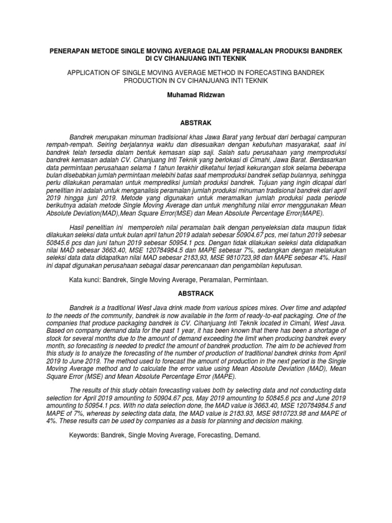 Application Of Single Moving Average Method In Forecasting Bandrek Production In Cv Cihanjuang Inti Teknik