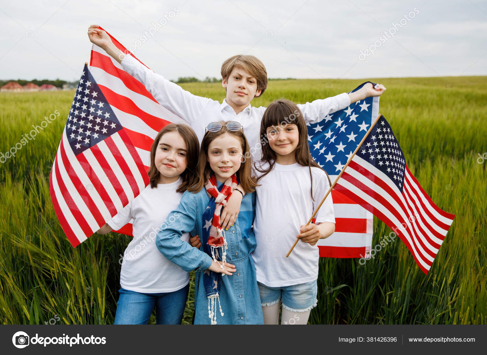 Empat anak yang ceria berdiri di lapangan dengan bendera Amerika di tangan mereka — Stok Foto © nazariykarkhut #381426396